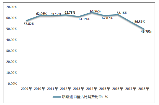2009-2018年我国进口奶酪占消费比重分析