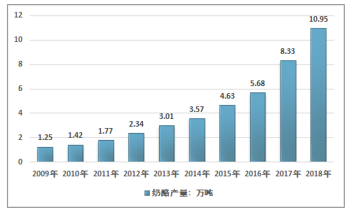 随着下游需求市场的崛起以及国内企业投资布局的增长,我国奶酪产量呈稳步增长态势,2009年我国奶酪产量为1.25万吨,到2018年我国奶酪产量增长至10.95万吨。