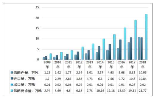 2009-2018年我国奶酪供需平衡走势