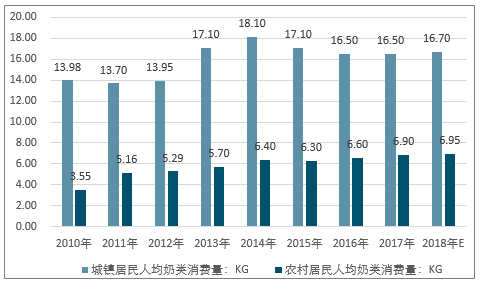 2010-2018年中国城镇居民和农村居民人均奶类消费量情况