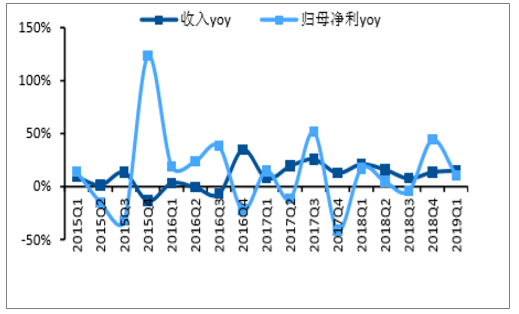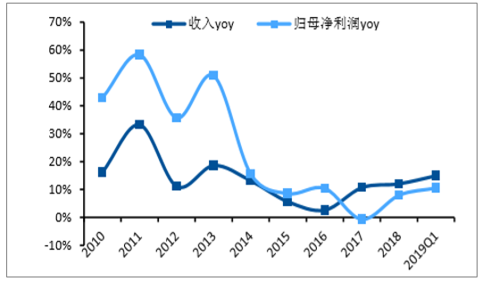2018全年及2019Q1乳制品板块营收及净利润增速出现小幅回升。2018全年,板块营收1276亿元,同比+12.1%,增速较2017年+10.7%和2016年+2.66%增速有所回升;板块归母净利润72亿元,同比+8%,较2017年-0.67%的增速有所回升,但仍然低于2016年+10.44%增速。2019Q1板块收入352亿元,同比+15%,高于2017Q1的+3.16%增速,但仍低于2018Q1的+20.98%增速水平;板块归母净利润27亿元,同比+10.5%,较2017Q1的+12.80%、2018Q1的+17.02%增速小幅下滑。总体看,乳制品两强争霸的局面依然稳固,2018年板块业绩表现出现小幅回升,2019Q1受成本端和营销费用压力,业绩表现同比小幅下滑。