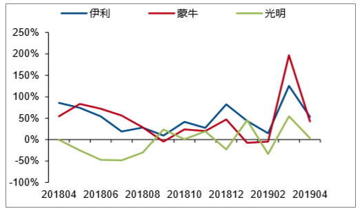 伊利、蒙牛增速较快,线上份额持续提升。4月阿里渠道伊利销售额1.15亿元,同比增长53.0%,销量189.15万件,同比增长34.1%,均价60.91元,同比提升14.0%;蒙牛销售额9945.75万元,同比增长42.4%,销量178.08万件,同比增长36.4%,均价55.85元,同比提升4.4%;光明销售额2842.10万元,同比增长3.3%,销量48.87万件,同比增长10.1%,均价58.16元,同比下降6.2%。伊利4月线上份额为23.4%,同比增长2.6pcts,蒙牛线上份额为20.2%,同比增长0.9pct。