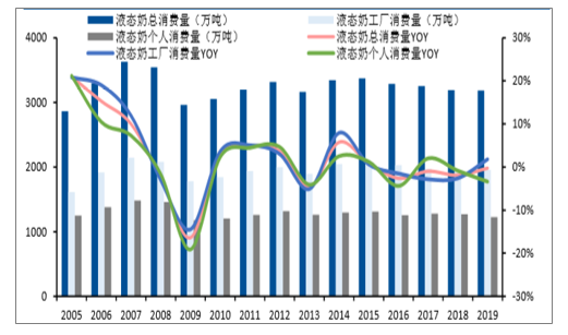 2018年我国液态奶消费总量为3191万吨,同比-1.91%;其中工厂/个人消费量分别为1921/1270万吨,同比分别-2.59%/-0.86%,中国奶业消费,总量增速将趋缓,但产品结构升级及地域消费扩张将依然持续。