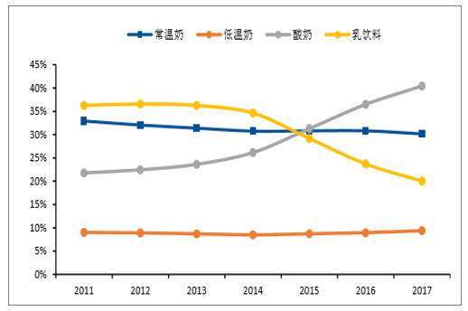 2.产品格局:巴氏奶、酸奶加强渗透,牛奶饮品、常温奶增速低迷