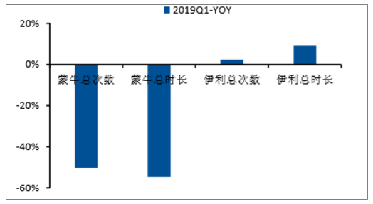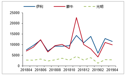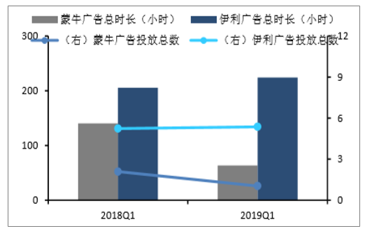 从广告投放数据看,2019Q1,蒙牛电视广告投放总时长/总次数分别为1.04万次/64小时,同比-50.3%/-54.7%,出现大幅下降;伊利电视广告投放分别为5.37万次/224小时,同比增速分别是+2.4%/+9.1%,仅出现小幅增长,低于收入端增速,显示两强空中广告端的竞争降温态势。