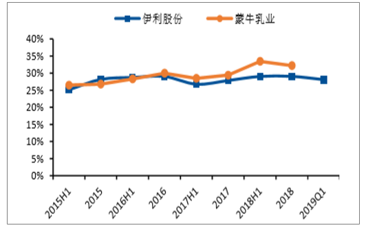 从费用投放看,2018年全年伊利/蒙牛期间费用率分别为29.06%/32.23%,较2018H1分别+0.01/-1.23个百分点。2019Q1伊利费用率为28.09%,环比-0.97个百分点广告投入方面,2018年伊利广告投入109.55亿元,占收入比重13.77%,较2018H1下降1.16个百分点。总体可见,2018年以来两强费用投放力度环比均有小幅下滑趋势。