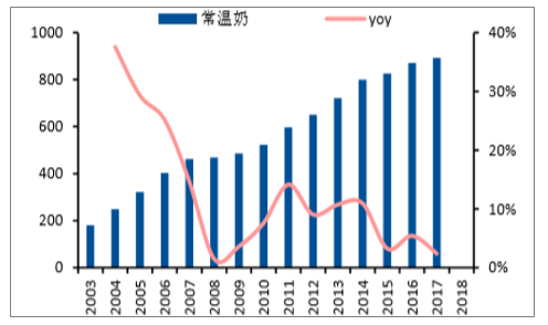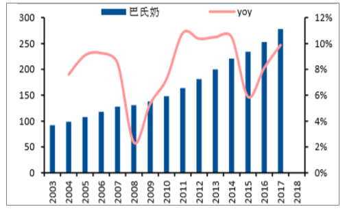 从主要产品的市场规模和增速看,牛奶饮品、常温奶、酸奶及酸奶饮品的市场规模较大,巴氏奶市场规模偏小。2017年牛奶饮品、常温奶、酸奶及酸奶饮品市场规模分别达到592/892/1219亿元,增速分别为-11.64%/+2.41%/+18.12%,其中牛奶饮品增速连续三年为负,市场规模从2014年高峰时的900亿元下滑到2017年的592亿元。巴氏奶市场规模较小,2017年为278亿元,同比+9.88%。从增速看,巴氏奶、酸奶保持较高增速,其中酸奶规模增速已多年保持20%左右的高位。常温奶增速自2014年开始下滑明显,市场已基本饱和。