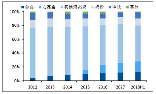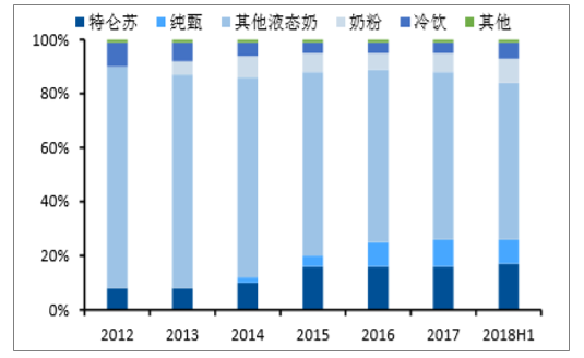 从产品结构演变看,常温奶占比较为稳定,且一直为乳制品主要品类,近年来一直在30%左右;酸奶占比上升较快,2015年以后占比超过常温奶成为第一大品类,2017年占比达到40%;低温奶受冷链运输成本的制约,占比较低,约为9%左右;受消费者收入提升及偏好改变影响,乳饮料占比逐年走低。预计未来两强及主要乳企的竞争核心将继续围绕常温奶尤其是常温高端白奶和酸奶两大品类展开。