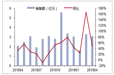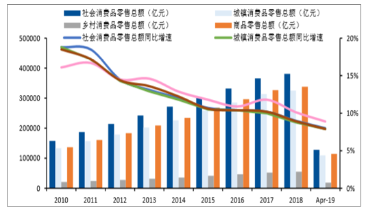 消费端,近年来全国消费品零售总额增速总体向下,2018年和2019年前4月,社会消费品零售总额分别完成38.1/12.84万亿元,同比+8.98%/+8%;其中2018年和2019年前4月城镇消费品零售总额分别为32.56/10.97万亿,同比+8.79%/+7.9%,略低于全国水平;农村消费品零售总额分别为5.53/1.87万亿,同比+10.12%/+8.9%,农村市场的消费品零售总额增速明显快于整体和城镇市场,显示出更强的消费意愿。