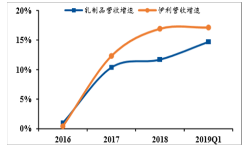2018年,伊利/蒙牛市占率分别为23.6%/22.4%,二者合计占比超过45%,两强格局依然稳固。光明、养元、娃哈哈、旺仔、雀巢等乳企的单个市场份额均在5%以下。从营收增速看,伊利股份2017年以来营收同比增速均快于A股上市乳企的行业整体增速,显示伊利股份的头部地位得到进一步强化。