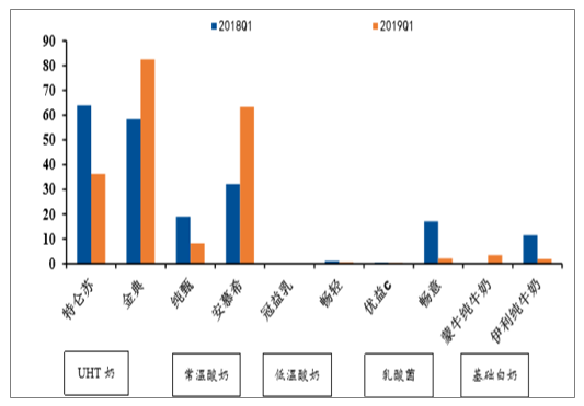 广告投放数据也支持判断。2019Q1蒙牛在广告播放时长大幅缩减的情况下,依然选择将大部分广告资源都投入在特仑苏上,并在纯甄酸牛奶上进行小幅投入,大单品