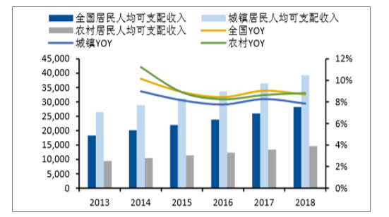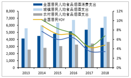 居民收入端,2018年全国居民人均可支配收入达到2.82万元,同比+8.68%,收入增速较2017年略有放缓但仍保持较高水平;其中城镇/农村人均可支配收入分别为3.93/1.46万元,同比+7.84%/+8.82%,农村居民收入增速高于城镇居民。食品支出方面,2018年全国居民食品烟酒人均支出5631元,同比+4.78%,较2017年小幅提升;其中城镇/农村人均食品烟酒支出分别为7239/3646元,同比+3.4%/+6.76%。农村食品消费增速接近城镇2倍,是未来消费品增长的主要方向。