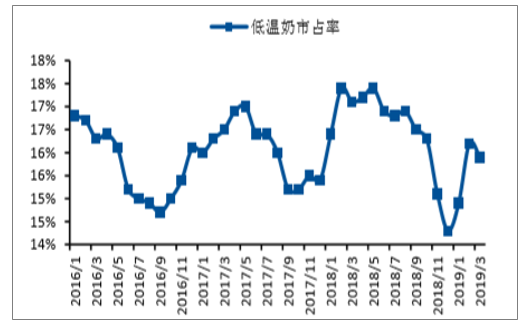 从具体产品的市占率看,伊利的主要优势产品在常温奶。截至2019年3月,伊利常温奶产品线市占率达到38.3%,较去年同期上升3.1个百分点,市场地位进一步得到强化。同时低温奶的竞争力也在不断加强,2019年3月,伊利低温奶产品线市占率为15.9%,市占率有所回升,止住了18Q4的下滑。