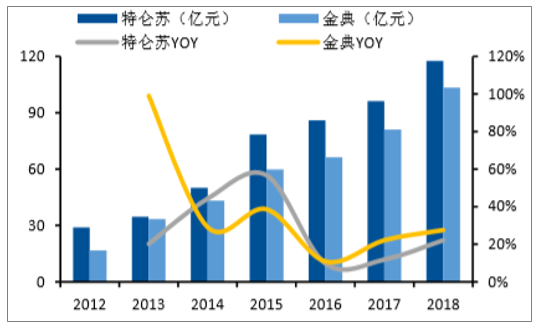 从销售构成看,2018年蒙牛特仑苏销售预计接近120亿元,稍稍领先于伊利金典约105亿元的销售额。不过,金典2016~2018年三年增速均高于特仑苏,二者规模差距在快速缩小。因此,年初就曾预判过,蒙牛守住特仑苏“国内第一高端白奶品牌”的战略