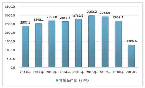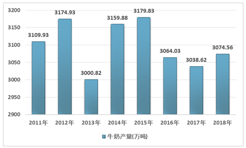 2011年我国牛奶产量3109.93万吨,2018年我国牛奶产量3074.56万吨,8年间我国牛奶产量维持小幅震荡的趋势。
