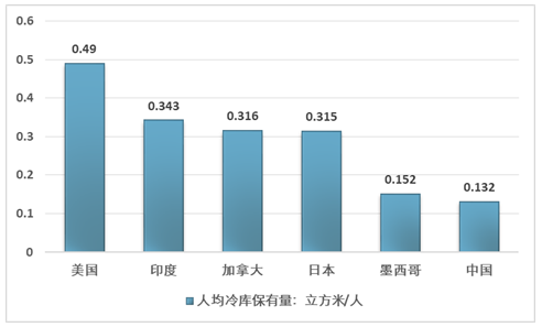 2018年中国人均冷库为0.132立方米/人,低于世界绝大部分发达国家,甚至低于经济不及中国的印度。