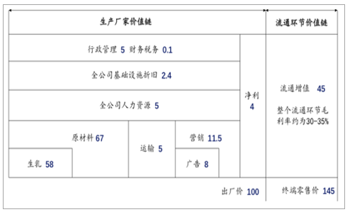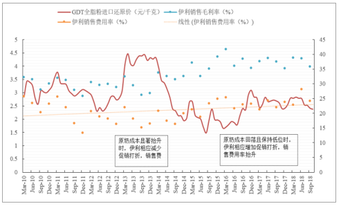 下游乳企的成本压力与竞争压力存此消彼长的关系。从过去原奶价格走势与乳制品龙头盈利能力的变动趋势看,当原奶价格出现抬升时,伊利及蒙牛的毛利率受成本压力有所下滑,但在行业性成本压力凸显时,乳制品主要企业会达成减少促销打折的默契,实现行业性的变相提价,以缓解成本压力。从过去两轮原奶涨价周期看,乳制品企业销售费用率的回落幅度大于毛利率的降幅,从而导致原奶价格上涨对乳企的净利润是正向影响。因而在判断行业竞争格局时,成本走势是一个重要参考因素。