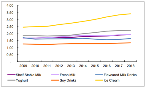 行业结构呈现优化。乳制品市场前三大品类分别为奶和奶油、酸奶及其他乳制品、冰激凌。2018结构占比分别为45.4%、28.7%以及9.2%,同比-1.1pct、0pct以及+0.1pct,各品类增速保持稳定,其中传统品类占比下滑,酸奶及其他乳制品占比有提升,乳制品行业呈现结构优化趋势。