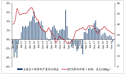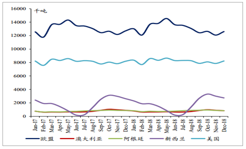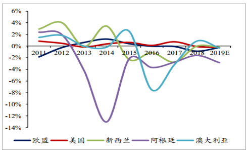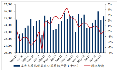 国际原奶价格与饲料价格仍有显著价差,奶农盈利存空间;五大主要乳制品出口国原奶产量同比保持增产。2019年1月国际原奶价格为33.6美元/100千克,国际饲料价格为22.0美元/100千克,存在11.6美元/100千克的盈利空间,不具减产动力最新数据显示,18年五大主要乳制品出口国合计原奶产量29680.3万吨,同比+1.0%。其中4国增产,1过减产,欧盟、澳大利亚、阿根廷、新西兰和美国原奶产量同比增速分别为+0.9%、-1.9%、+4.3%、+2.3%和+0.9%。