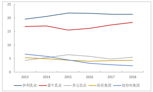 头部企业份额相对集中。乳制品市场两大龙头企业为伊利乳业和蒙牛乳业,2018市占率分别为16.2%以及12.7%,龙头企业份额集中。饮用奶市场伊利和蒙牛依然处在遥遥领先状态,2018市占率分别为21.3%以及18.3%,市场份额保持稳定。
