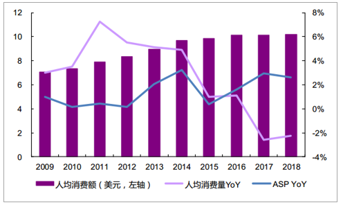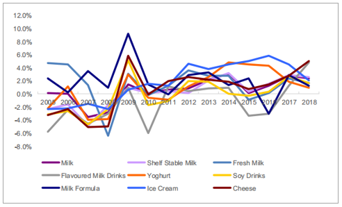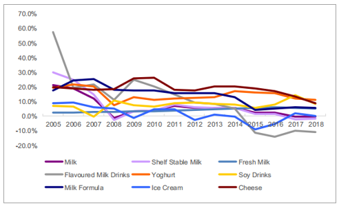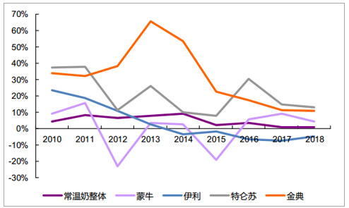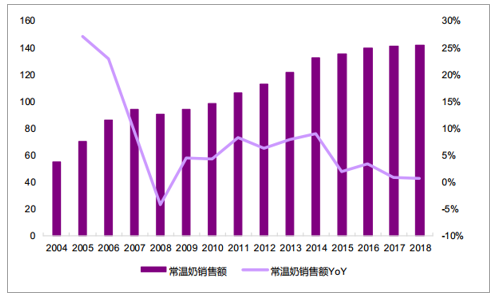 我们注意到,行业龙头始终关注细分领域迭代趋势,一方面通过结构优化提升常温奶品类的附加价值,同时将业务版图延伸至符合消费升级的新兴领域,以掌握行业发展先机。1)受地理因素和消费结构影响,我们认为常温奶在较长时间内仍将为国内液态奶的最主要贡献品类。2018年,我国常温奶销售额实现142亿美元,占饮用乳销售额约75%,持续主导地位。而自14年以来,常温奶行业整体增速降档,2018年增长率约0.7%。
