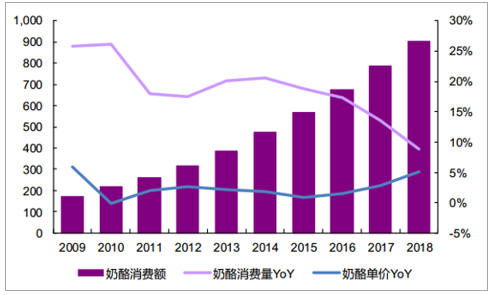 随着居民消费能力及习惯变迁,我们观察到乳制品行业各品类增速出现分化。常温奶作为我国乳制品消费主要品类,目前整体消费量已达较高水平,自17年起销售额增长主要由提价带来;而奶粉、低温奶及其他品类(如功能饮料、乳酪)则体现量价齐升态势,处于由需求推动的高速发展阶段。