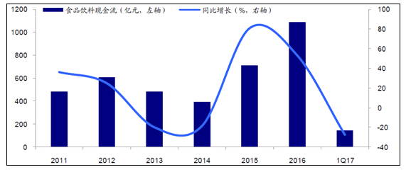 2016年食品饮料行业经营活动共产生现金流1087.4亿元,同比增长53.2%;饮料行业经营活动现金流743.1亿元,同比增长73.9%,主要受白酒行业景气度回升、经营活动现金流增长带动;食品行业经营活动现金流344.3亿元,同比增长21.8%。