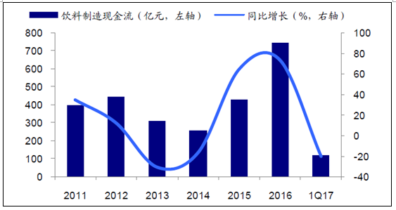 近年来饮料制造行业经营活动现金流情况