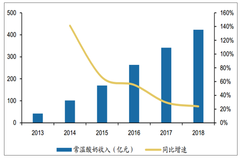 常温酸奶是中国大陆2012年新诞生品类,2018年常温酸奶收入423亿元,近5年复合增长58.48%,同比增速维持20%+。常温酸奶不受冷链限制,未来仍有较大的发展空间——彭博数据显示,对比发展较成熟的白奶品类,不受冷链限制的常温白奶目前收入规模为巴氏奶(需冷链运输贮藏)的3倍左右,2018年常温酸奶仅为低温酸奶收入规模的45%,扩容空间大。