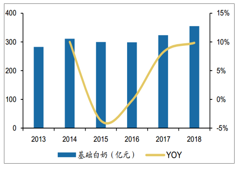 基础白奶为成熟品类,2018年中国大陆基础白奶收入355亿元,近5年复合增长4.67%,主要依赖销量增长。其中2015-2016年收入下滑主要源于行业需求逐渐饱和,且乳企主动减少基础白奶、尤其是低端基础白奶生产, 2015、2016年低端基础白奶(百利包)收入分别同比减少26.3%和31.8%。2017年以来需求回暖,主要源于下线城市乳制品消费崛起、且消费者逐渐接受中高端基础白奶(利乐枕、无菌砖)。