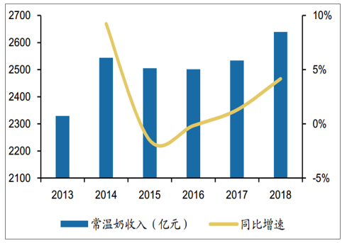 2018年中国大陆常温奶收入2639亿元,近5年(2013-2018年)复合增长2.53%。常温奶不受冷链限制,最容易实现放量,对比其他国家和地区,我国液奶仍有扩容空间,但扩容比例不大,预计扩容速度维持低位——2018年中国大陆液奶人均消费量14.33kg/人,为中国香港、日本、韩国的63%、70%、74%。2016年以来常温奶行业增速逐渐回升,2018年同比增速达4.16%。