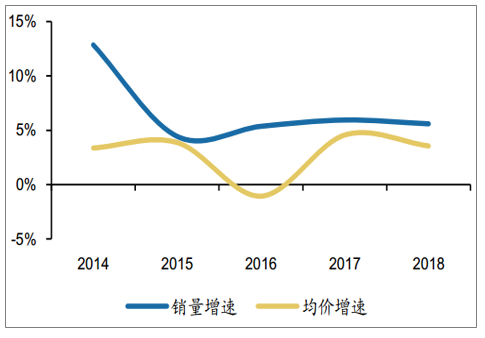 婴幼儿奶粉市场销售规模破千亿,预计未来5年复合增长7%左右。2006年以来中国大陆婴幼儿奶粉行业快速发展,14年突破千亿,2013-2018年行业规模复合增长9.83%,2018年市场规模达到1626亿元。分拆量价来看,行业增长主要源于量增,近5年(2013-2018年)行业销量复合增长6.80%,均价复合增长2.84%。