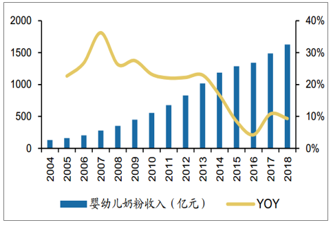 2013-2018年中国大陆婴幼儿配方奶粉收入复合增长9.83%