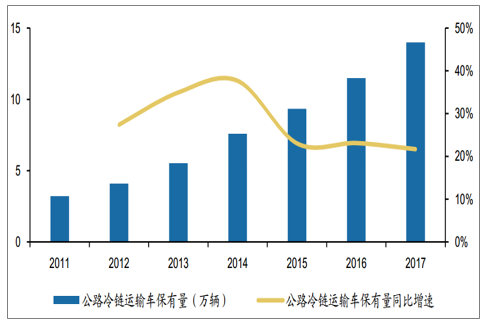 近5年我国公路冷链运输车保有量复合增长27.90%