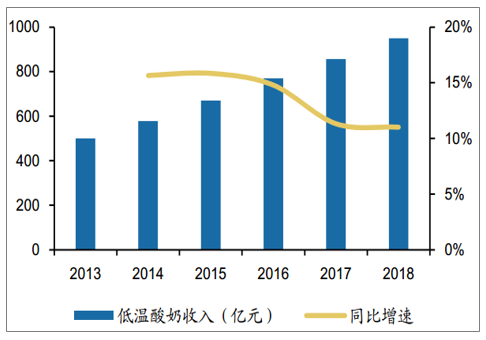近5年中国大陆低温酸奶收入CAGR=13.70%