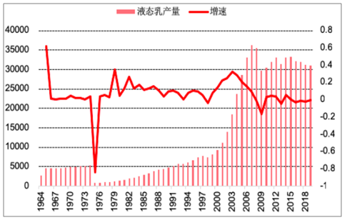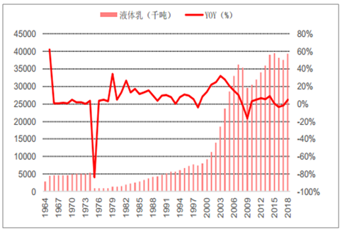 我国液态乳的产量随生鲜乳产量的走势而变动。自 1964 年到 1996 年,虽前期受历史事件些许影响,液态乳产量复合增速达到3.2%。随后自 1996 年到2008 年,技术进步行业快速发展,液态乳产量增长4倍,自 736万吨增长到3545万吨,复合增速达到14%。后期液态奶产量受三聚氰胺事件影响行业出现剧烈波动,液态乳复合增速下降至 3.38%,2011 年后产量保持稳定,维持3100到3400万吨范围内,2018 年年液态乳产量为 3110万吨。