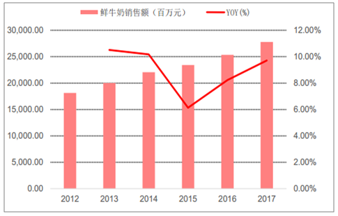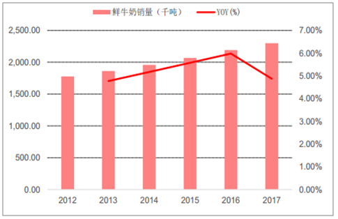 随着人们健康养生观念的深化,低温巴氏奶作为最为新鲜、保有牛奶原始价值的乳制品, 成为越来越多人们的消费选择,近五年来销售规模以约 8.94%的复合增速持续增加,由 2012 年 181 亿元增长至 2017 年 277 亿元, 2017 年销量也稳步攀升至约 230 吨。随着消费认知逐渐培育,低温巴氏奶将成为消费升级的重要方向之一。