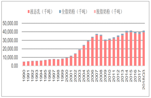从液态乳消费量来看,自 1980 年以来消费量实现约 27 倍提升,由 1980 年的 136.7 万吨大幅增长至 2018年的 3943万吨,复合增速 9.25%。结合经济增长情况来看,人均 GDP由 1990年 317.88美元持续高速提升至 8123.18美元,是液态乳消费增长的重要推动力。具体看, 1996 年之前,由于原奶产量低,且受制于运输技术等市场较为局限,液态乳消费缓慢攀升,与人均 GDP 增长基本保持一致。 1996 年, 利乐包的引入和杀菌技术的升级开启全国性牛奶市场,此前未开发的市场需求得到释放, 2007 年液体乳消费达 3629.2 万吨。 1996-2007 年人均 GDP由 709.4 美元增长至 2695.36 美元,复合增速高达 12.90%,液态乳也呈现高速增长,消费量增加 2894.3 万吨,复合增速达 15.63%。然而 2008 年三聚氰胺事件爆发, 2009 年液态乳消费直降至 2961.8 万吨,与 2007 年相比下跌 9.66%,中国乳业遭受重创。不过随着一系列增强消费者信心的措施落地,且人均 GDP 以 12.09%超高速强劲推动,2010 年开始, 乳业重回发展快车道, 到 2015 年消费量达 3948.5 万吨, 2010-2015 液体乳消费复合增速 5.28%。 2015 年-2018 年,人均 GDP 增速放缓,液态乳消费量下行 55 吨至 3943 万吨,主要与当前消费升级背景下产品结构升级调整有关。