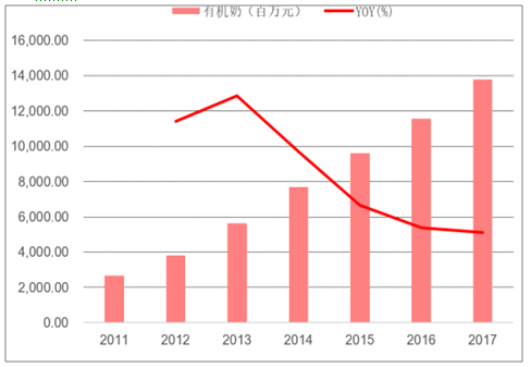 自 2005 年高端白奶“特仑苏”上市以来,高端白奶的消费规模稳定增长,有机奶作为高端白奶最具代表性的品类,总体市场规模由 2011 年不足 30 亿元高速增长至 2017 年的近 140 亿元,年复合增速达 31.48%。