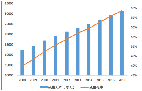 城镇化率逐年提高,2017年达到58.52%