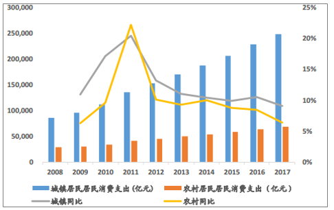 国内城镇和农村居民消费支出持续提升
