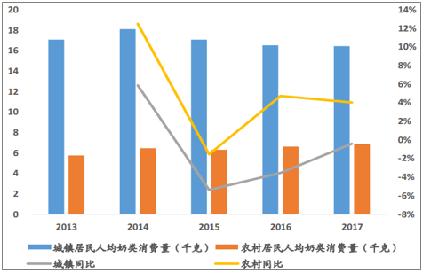 农村人均奶类消费低于城镇消费但增速较快