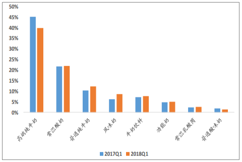乳制品线上销售增速超过 45%,80、90 后是消费主力。 随着近年来电商行业爆发,乳制品线上销售快速放量,液态奶线上销售占比从 2010 年的 0.3%快速提升到 2017年 9.4%,同时连续季度销售保持 45%以上增长。 婴幼儿奶粉是线上乳制品销售主要贡献者,成人奶粉规模较小但增长最迅速, 2018Q1 同比增长约 120%。液态奶领域,高端奶依旧占据主导位臵,酸奶品类逐步增多,市场份额逐步加大。 80、90 后为线上消费主力群体,线上消费持续高增拉动乳制品行业放量。