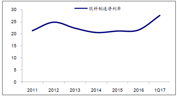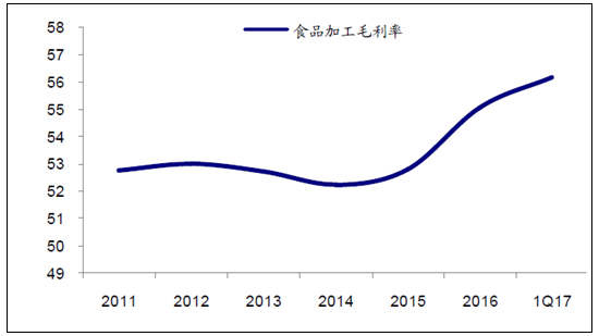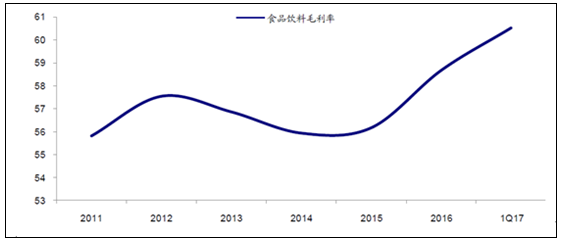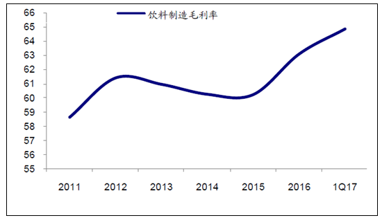 2016年食品饮料行业毛利率58.67%,同比提升2.52pct。其中饮料行业毛利率为63.08%,同比提升2.86pct;食品行业毛利率55.08%,同比提升2.27pct。