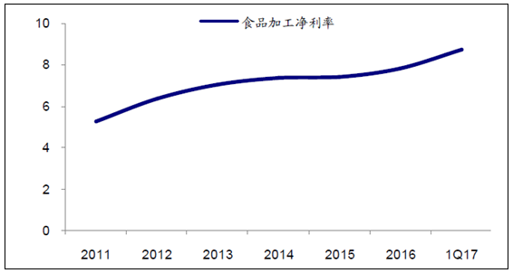 2016 年食品行业净利率同比提升0.42pct(单位:%)