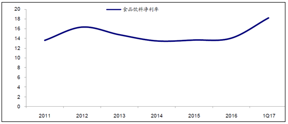 2016年食品饮料行业实现归母净利润573.6亿元/+10.7%;1Q17实现归母净利润227.6亿元/+17.8%