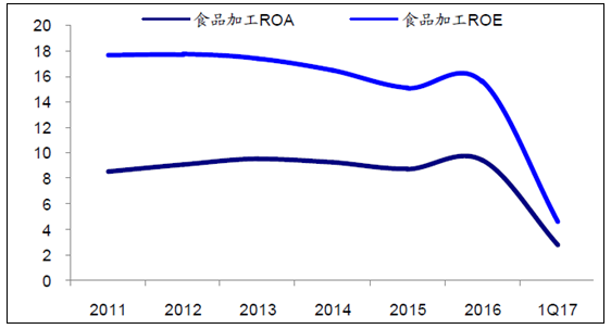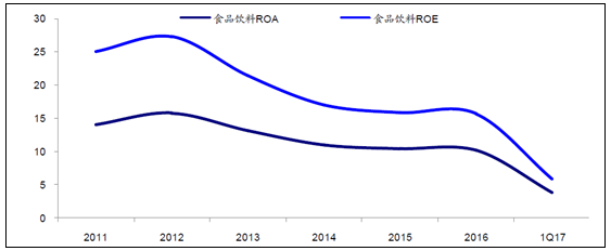 2017年一季度食品饮料行业ROA为3.87%,同比增加0.26pct;ROE为5.9%,同比增加0.50pct。饮料行业ROA为4.40%,食品行业ROA为2.81%,分别同比增加0.28pct和增加0.13pct;饮料行业ROE6.45%,食品行业ROE4.64%,分别同比增肌0.61pct和增加0.18pct。