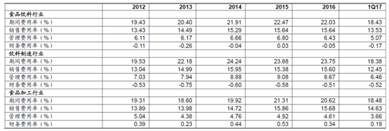 2017年一季度食品饮料行业期间费用率18.43%,同比减少1.34pct;其中销售费用率13.53%,同比下降0.75pct;管理费用率5.07%,同比减少0.50pct;财务费用率-0.17%,同比下降0.10pct。饮料制造行业期间费用率18.38%,同比下降0.22pct;其中销售费用率12.45%,同比增加0.25pct;管理费用率6.46%,同比下降0.37pct;财务费用率-0.52%,同比下降0.10pct。食品加工行业期间费用率18.48%,同比下降2.45pct;其中销售费用率14.63%,同比下降1.72pct;管理费用率3.66%,同比下降0.65pct;财务费用率0.19%,同比下降0.08pct。