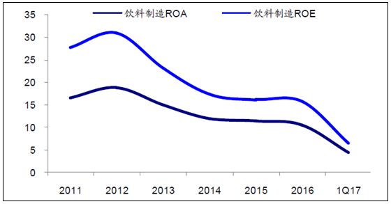 近年来饮料制造行业ROA 与ROE(单位:%)
