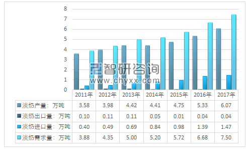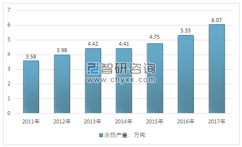 目前,国内淡奶行业产量影响因素主要是有:原材料供给和运输以及国内消费对淡奶需求的不断增长。随着国内居民收入水平的提高,国内居民对淡奶需求量不断增长。过去国内淡奶行业产品主要是出口到国外,随着国内外国食品企业的进入,餐饮以及食品加工企业对淡奶需求不断增长,需求市场扩大加大国内淡奶企业产能投产规模。近几年我国淡奶产量快速增长从2011年的3.58万吨增长到2017年的6.07万吨,如下图所示: